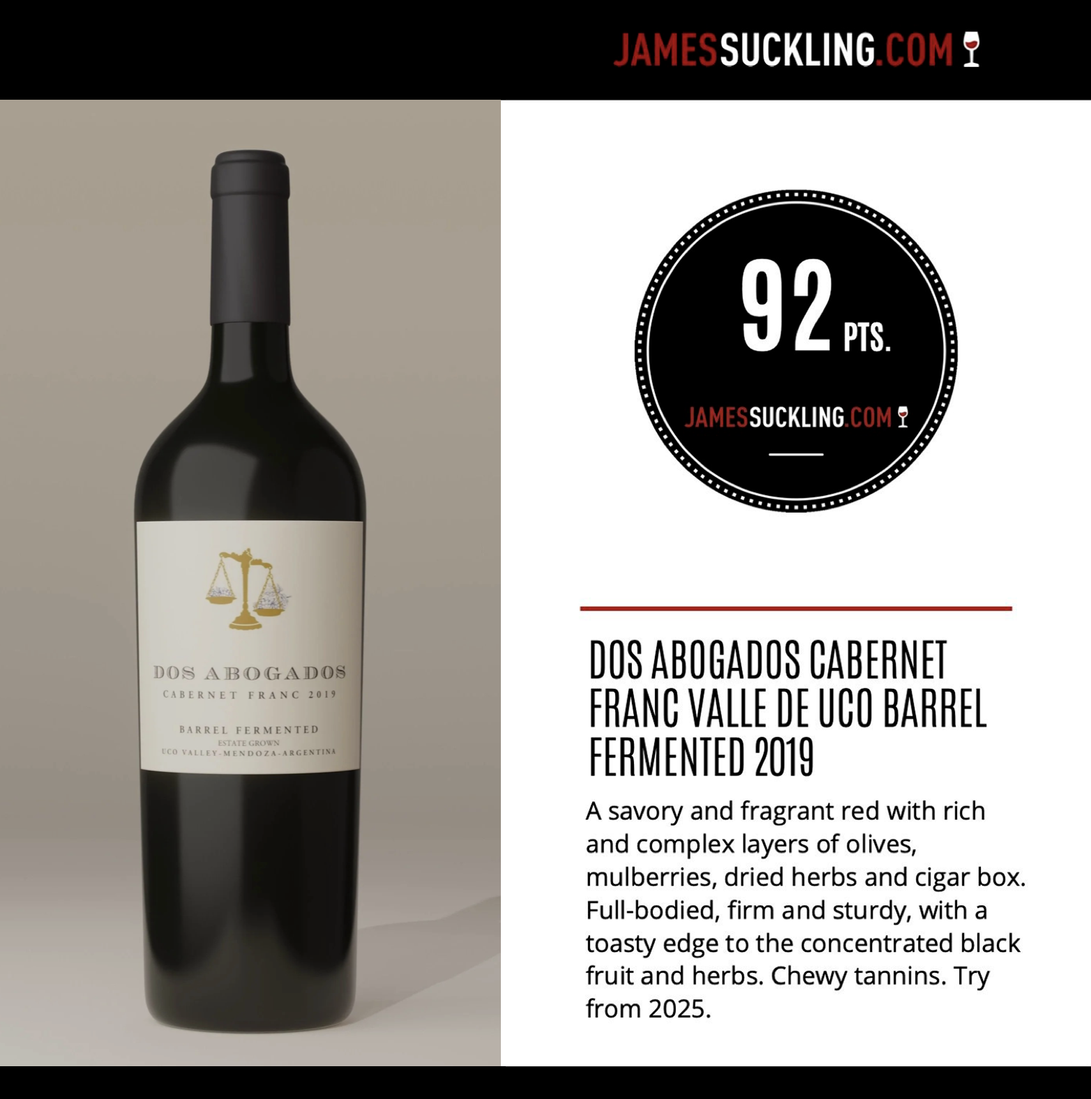 While Malbec is known as the wine of Argentina, Cab Franc from Argentina is gaining widespread recognition and devoted fans. Dos Abogados recognized this grape’s great potential and planted Cab Franc back in 2014. One of our flagship wines is the Barrel Fermented Cab Franc, which is both fermented and aged in new French Oak. The 2019 vintage was awarded 92 points by James Suckling, a remarkably high score for a limited production wine producer.